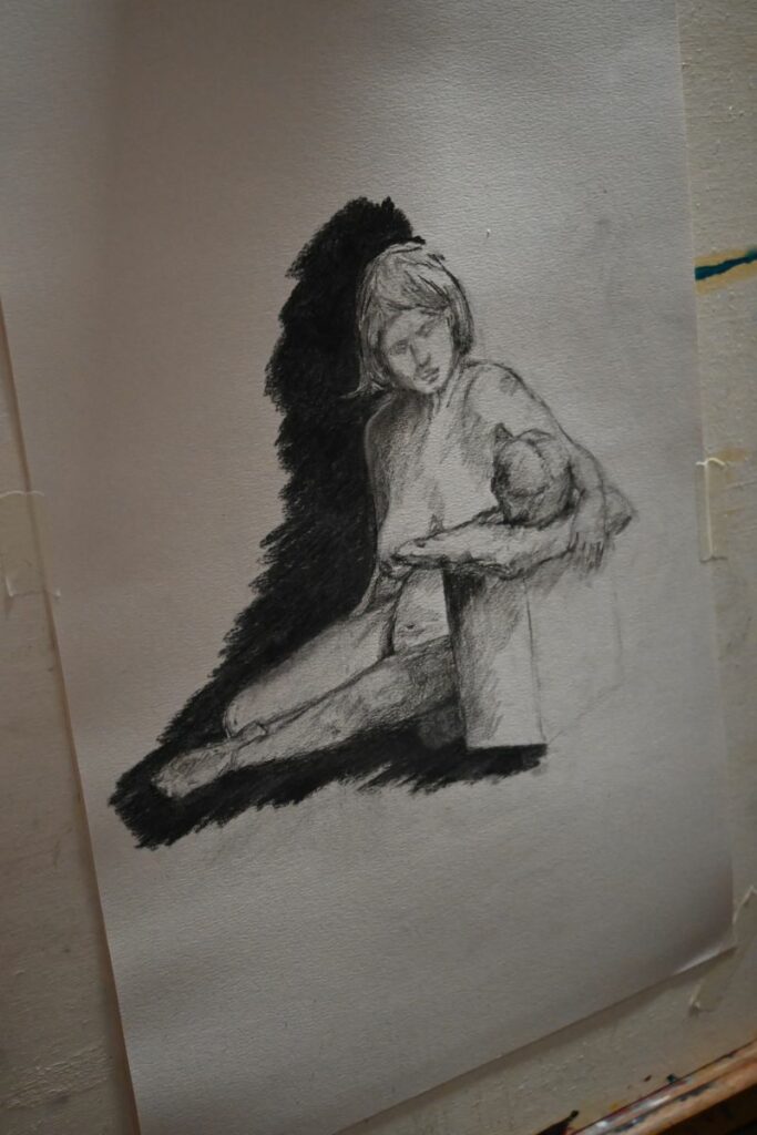 Il ritratto dal vero a carboncino comincerà col coprire tutta la superficie del foglio con la polvere di carboncino nero: il buio ovunque. Costruiremo poi le luci, i mezzi-toni, gli scuri-scuri e tutti i dettagli a partire da quel nero totale con una tecnica che è forse più simile alla pittura che al disegno.